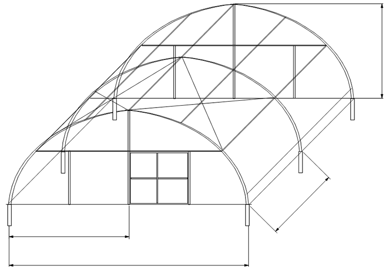 - Refuerzos internos cada 2 metros que sirven como soporte de malla de sombreo, mallas corredizas, riego por aspersión, sistema de iluminación, entutorado de plantas, macetas colgantes, mangas de calefacción, etc.