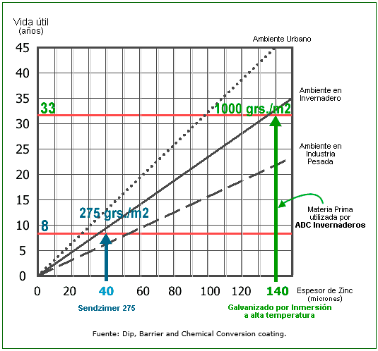 Es importante saber que la vida útil del material que conforma un invernadero está directamente relacionada con el espesor de la capa protectora de zinc que lo recubre (cuadro l).El proceso elegido por A.D.C. Invernaderos deposita sobre el acero una capa protectora de zinc cuyo espesor ronda los 130-150 micrones en ambas caras equivalente a unos 1.000 gr/m2, (casi cuatro veces mas que la capa protectora que presentan los invernaderos fabricados con proceso Sendzimer cuyo recubrimiento es de 275 gr/m2, equivalente a 36-42 micrones en ambas caras), lo que garantiza una protección anticorrosiva por más de 30 años, con costo de mantenimiento nulo.