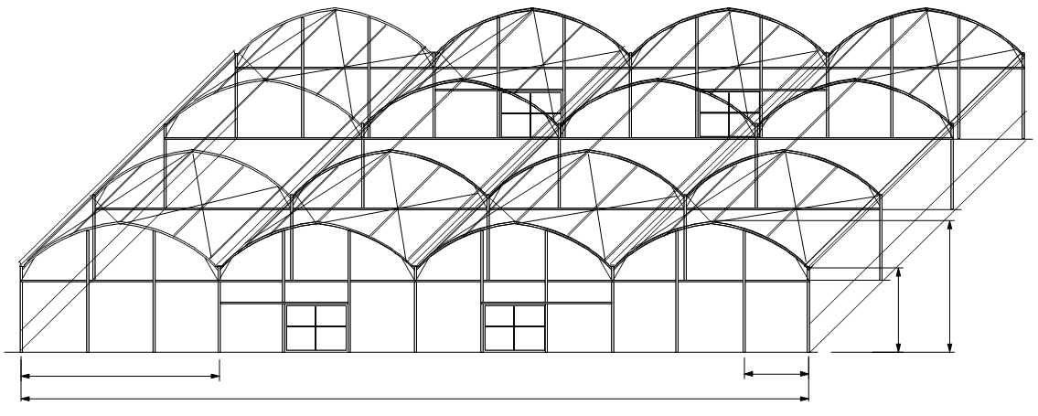 - Refuerzos internos cada 3 metros que sirven como soporte de malla de sombreo, mallas corredizas, riego por aspersión, sistema de iluminación, entutorado de plantas, macetas colgantes, mangas de calefacción etc.